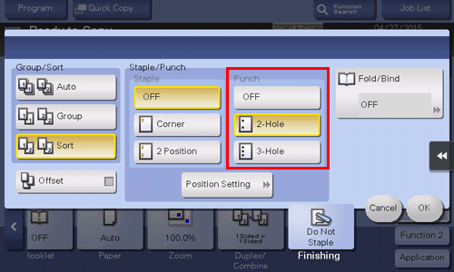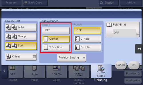 [Position Setting] | Select the punch position and original loading direction. If [Auto] is specified for the punch position, the punch position is determined automatically based on the direction of the loaded original. |