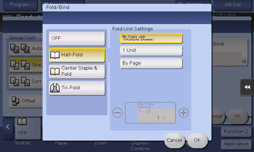 Feeds out a copied sheet by folding it in two. Also select the unit by which the paper is folded from [By Copy Job (Multiple Sheets)], [1 Unit], and [By Page]. When you set [By Page], specify the number of pages to be folded at one time.