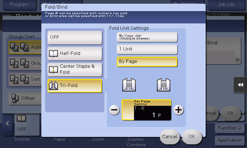 Feeds out a copied sheet by folding it in three. Also select the unit by which the paper is folded from [By Copy Job (Multiple Sheets)], [1 Unit], and [By Page]. When you set [By Page], specify the number of pages to be folded at one time.