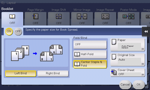 If Center Staple is enabled, [Booklet] is set to [ON] automatically.