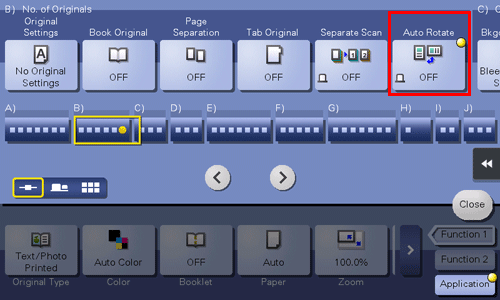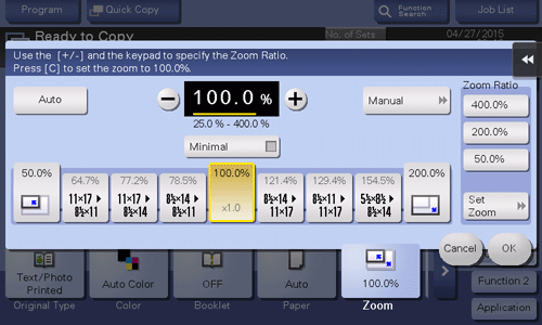 [Auto] | Tap this button to automatically make a copy with the optimal zoom ratio to match the image of the original with the paper size. This is convenient because you do not need to specify the zoom ratio. |