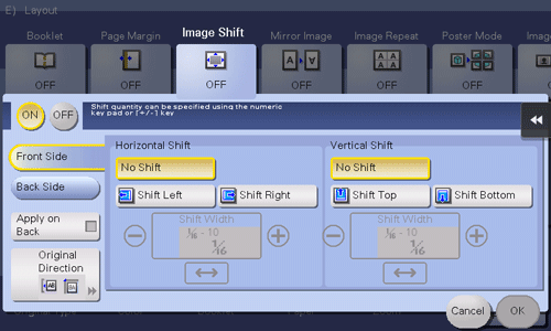 [Front Side]/[Back Side] | Adjust the image position on the print paper, by shifting the original image in horizontal or vertical direction.