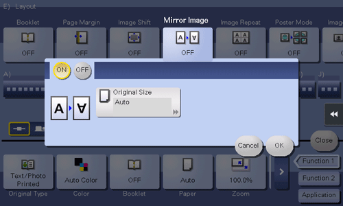 [ON]/[OFF] | Select [ON] to specify Mirror Image. |