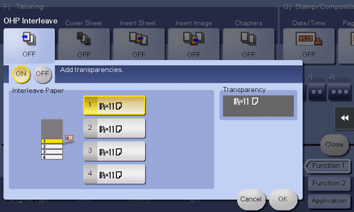 [Interleave Paper] | Select the paper tray for the paper to be inserted between transparencies. The paper size of the transparencies loaded on the Bypass Tray is displayed in [Transparency]. Be sure to use the same size for loaded transparencies and the paper to be inserted. |