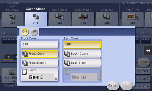 [ON]/[OFF] | Select [ON] to specify Cover Sheet. |