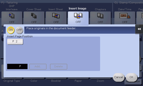 [Insert Page Position] | Specify a page number you want to insert a sheet into. The original is inserted after the page you have specified.
