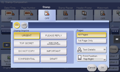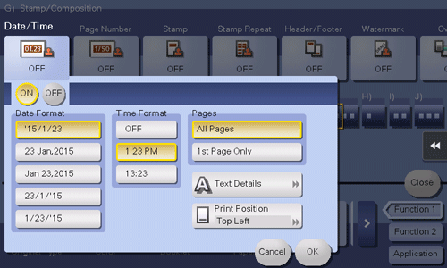 Select the stamping position and format, and add the date and time on copied sheets. The date and time can be printed either on all pages or only on the first page.