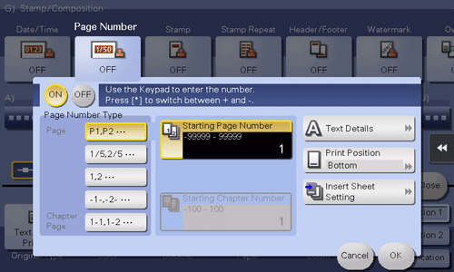 [Starting Page Number] | Enter the starting page number to be printed on the first page using the Keypad. To display the Keypad, tap the input area for the numeral. For example, to print page numbers from the third page of the original, enter "-1". The first page of the original is counted as "-1", and the second page as "0", and the third page is counted as "1". In [Starting Page Number], a page number is printed on pages 1 and later. If "2" is entered, page numbers are printed from the first page of the original as "2, 3", etc. in order. The "-" (minus sign) changes to + each time you tap [*]. |