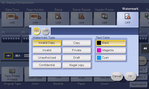 Part of the watermark may be lost depending on the paper size, such as A6 and B6. In this case, the machine automatically cancels the watermark function for copying.