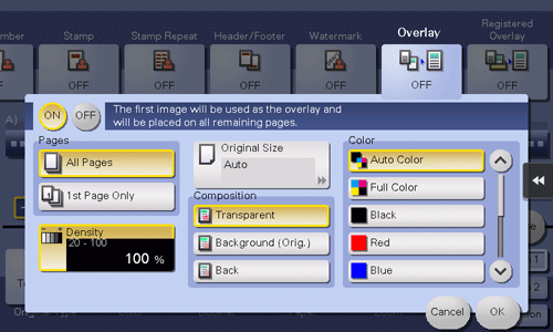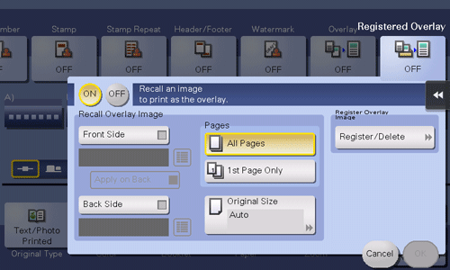 [Recall Overlay Image] | Specify which side of the paper to compose the overlay image, and select an overlay image to be composed. Check the density, composition method, preview, and other conditions of overlay image if necessary. If you set [Apply on Back], the image on the front side is composed on the back side of paper. |