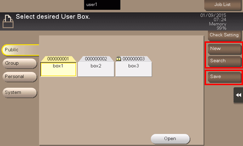 Tap [Utility] - [One-Touch/User Box Registration] - [Create User Box] - [Public/Personal User Box] - [New].