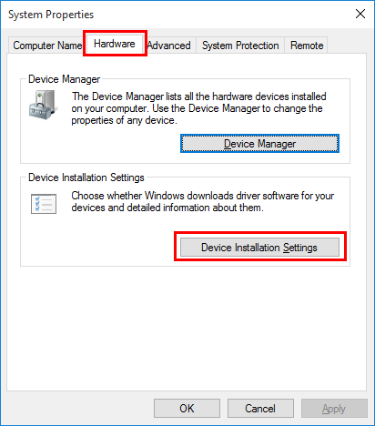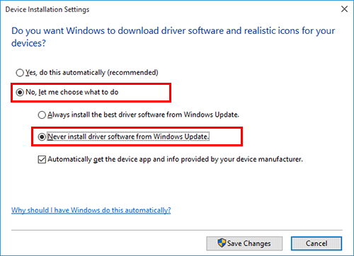 Select [No, let me choose what to do], select [Never install driver software from Windows Update.], then click [Save Changes].