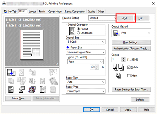 In the [Printing Preferences] window, set the print conditions you want to register as a favorite.