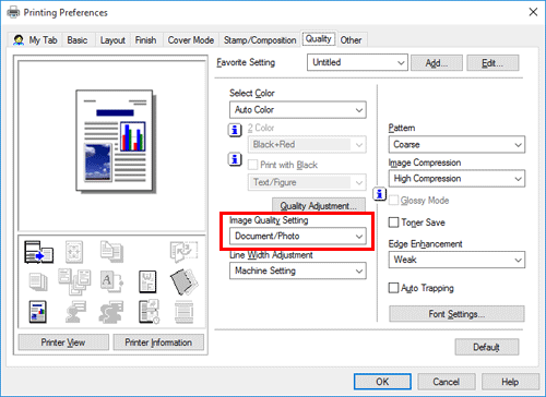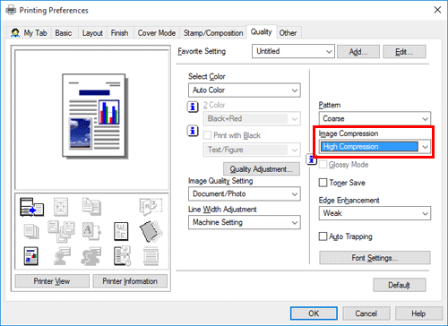 In [Image Compression] in the [Quality] tab, select whether the quality or printing speed is preferred when the image data contained in the original is compressed.