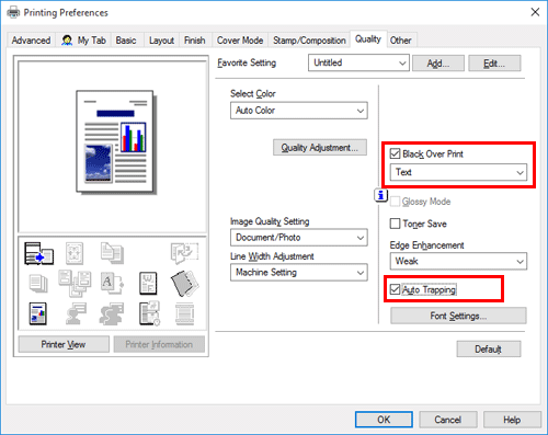 In the [Quality] tab, select the [Auto Trapping] check box or configure the [Black Over Print] setting.