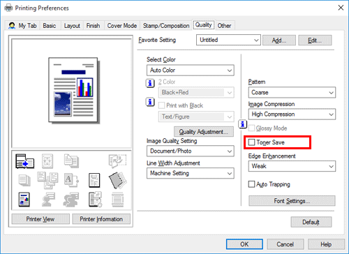 Selecting the [Toner Save] check box in the [Quality] tab adjusts the printing density in order to save the amount of toner consumed.