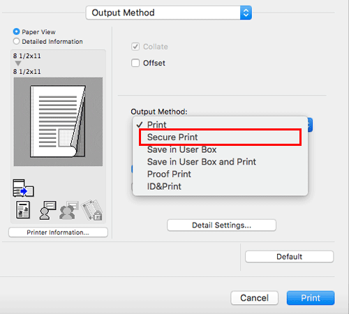 In [Output Method:] in the [Output Method] window, select [Secure Print].