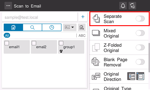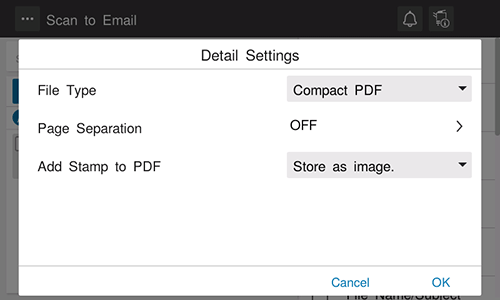 [Page Separation] | When you want to separate a file for each page while the original consists of multiple pages, set [Page Separation] to ON. This is not available when [File Type] is set to [JPEG]. All pages are separated.