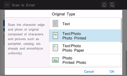 [Text/Photo - Printed Photo] | Scans an original consisting primarily of text and photos at the optimum image quality level. This function sharpens the edges of each character and reproduces smoother photos. Select this option to scan printed originals such as brochures and catalogs. |