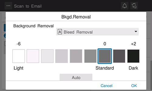 [Bleed Removal] | Adjust the density of the background color to prevent bleeding of the back of the paper when printing a 2-sided original that is so thin that the contents of the back side would be scanned. Selecting [Auto] automatically determines the density of the background color, and scans an original at the optimum background density level. |