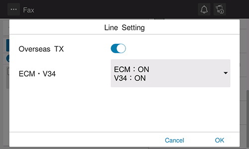 [ECM V34] | ECM is an error correction mode defined by ITU-T (International Telecommunication Union - Telecommunication Standardization Sector). Fax machines equipped with the ECM feature communicate with each other, confirming that the sent data is free of errors. This prevents image blurring caused by telephone line noise. Communication time can be reduced by setting ECM to OFF for transmission. However, an image error or communication error may occur depending on the specified communication time value, so change the value to suit conditions. V.34 is a communication mode used for the Super G3 fax communication. When the remote machine or this machine is connected to a telephone line via PBX, however, you may not establish a communication in the super G3 mode depending on telephone line conditions. In this case, it is recommended that you turn the V.34 mode off to send data. |