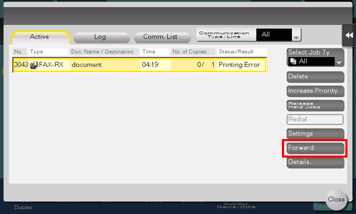 3. Select a job to be forwarded, specify the forwarding destination and also tap [OK].
