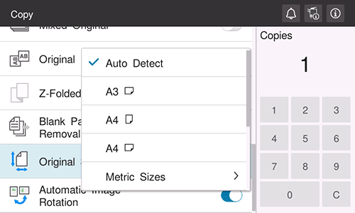 In general use, this machine automatically rotates the original image according to the paper direction to make a copy. Turning [Automatic Image Rotation] OFF as needed enables you to make a copy without rotating the original image. This function is available when you want to copy only a part of the original.