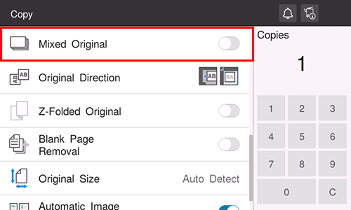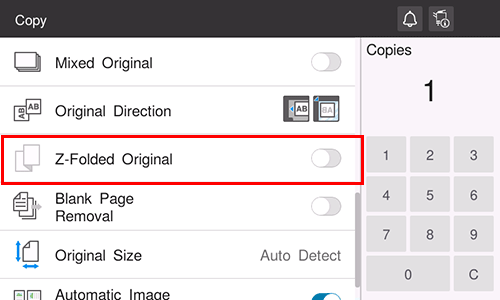 If a folded original is loaded into the ADF, the original size may not be able be detected accurately. To scan the folded original on the ADF, set this option to ON.
