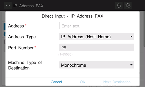 • If [E-mail Address] is selected for [Address Type], enter the destination E-mail address. To specify a destination using an E-mail address, enter the recipient's IP address following "ipaddrfax@". To enter an IP address, enclose it with brackets [ ].