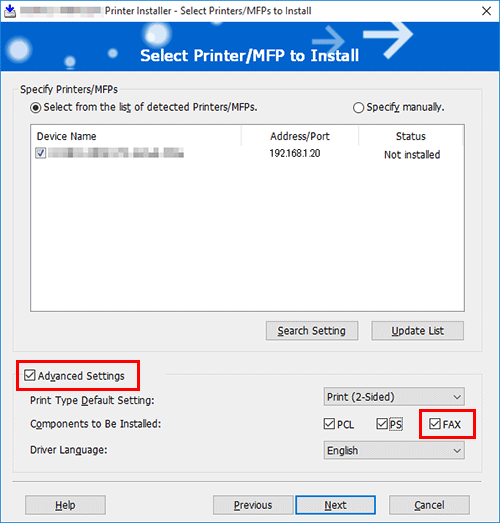 Select the [Advanced Settings] check box, and check that [FAX] is selected in [Components to Be Installed].