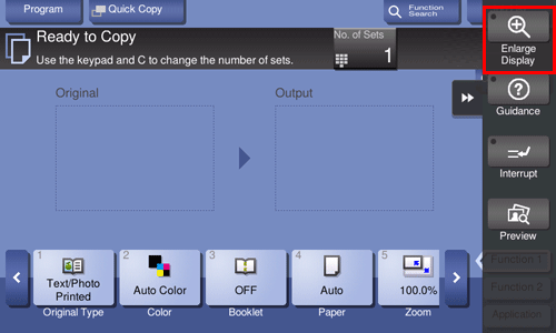 This function configures a screen layout focused on commonly used functions, enabling a user who has difficulty viewing the normal screen to easily perform operations. To return to the normal screen, tap [Enlarge Display] again.