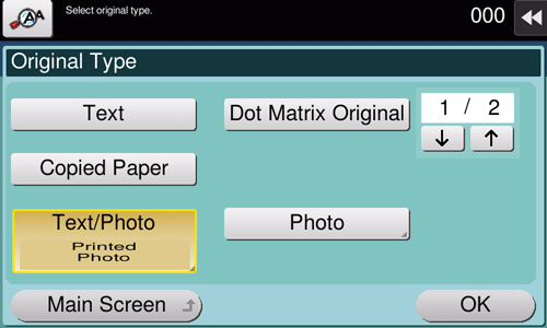 [Dot Matrix Original] | Scans an original, which consists primarily of text such as thin or faint characters, at the optimum image quality level. This function reproduces text using high pixel density, creating easy-to-read text. |
