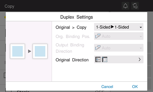 In [Original > Copy], select [1-Sided > 2-Sided], and select a desired bind position for copying in [Output Bind Dir.].