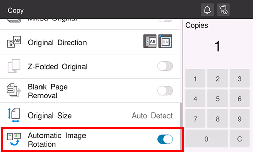 In [Automatic Image Rotation], select the item in accordance with the current orientation of the paper and original, then tap [OK].