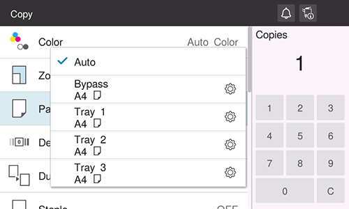 [Paper] | Select the paper tray where paper for copying is loaded. |