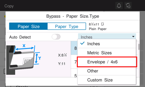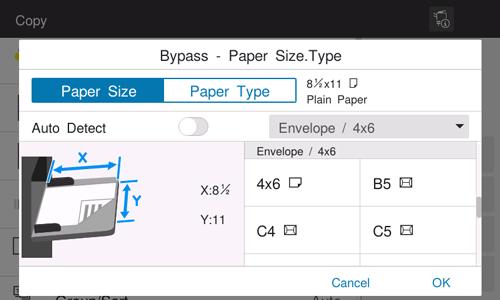 Load envelopes or postcards into the Bypass Tray, then specify the paper type and paper size of the Bypass Tray.