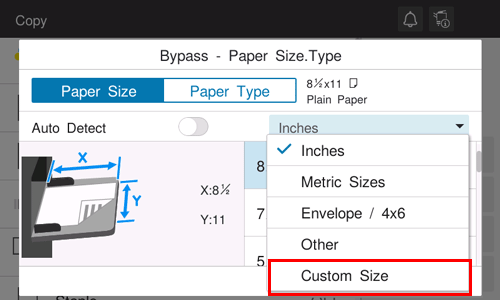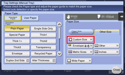 On the paper screen of copy mode, specify the tray containing custom size paper; this will enable you to print on custom size paper.