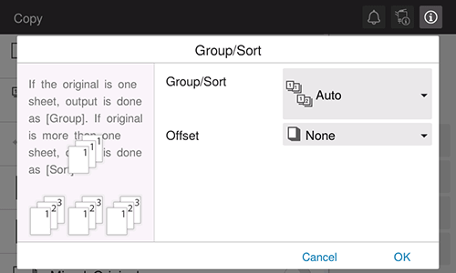 [Cover Sheet] | Use this option to copy the front and back covers onto separate paper when copying an original with a front or back cover. When copying an original without a front or back cover, you can use this function to have blank sheets of paper inserted as the front and back covers. |