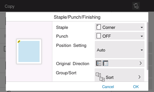 [Position Setting] | Select a desired staple or hole-punch position. Setting to [Auto] automatically determines the stapling and punching positions based on the direction of the loaded original. |