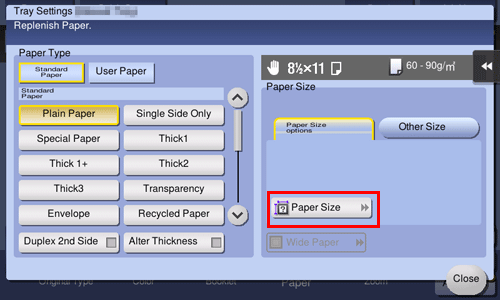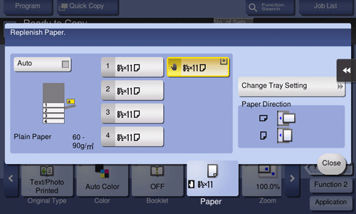 Tap [Paper], select Tray 1, Tray 2, or Bypass Tray, and tap [Change Tray Setting].