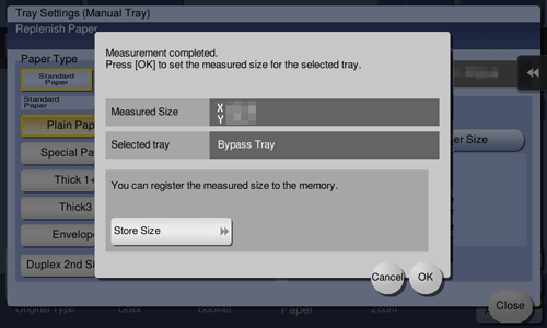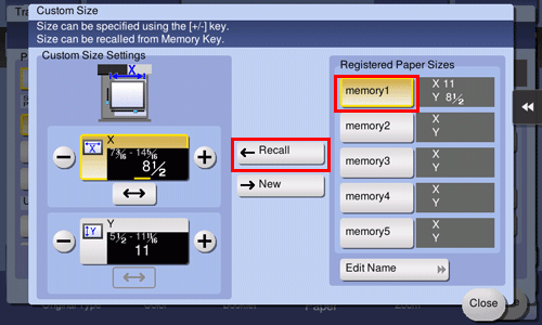 Select the paper size to recall from [Registered Paper Sizes], then tap [Recall].