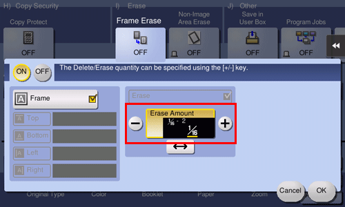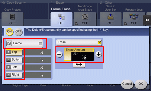 To specify the width of the frame to be erased individually, set [Frame] to OFF, select a target side, then specify the width to be erased.