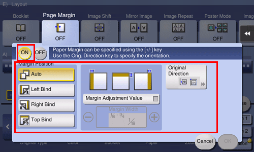 [Margin Position] | Select the position for creating the page margin for binding. When [Auto] is selected, the binding position is automatically set. |