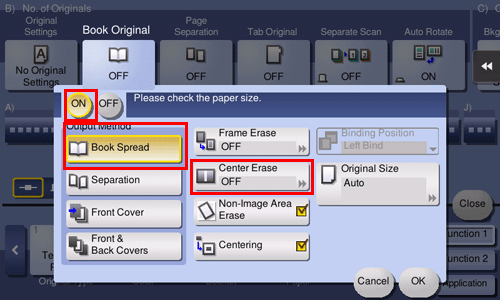 Tap [ON], select [Book Spread], then tap [Center Erase].
