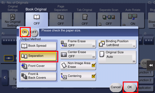 A. Yes. Specify the scanning method to Separation to have spread pages copied one by one on separate pages.
