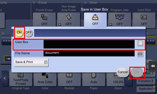 Tap [ON], select a User Box to use for saving in [User Box], then tap [OK].