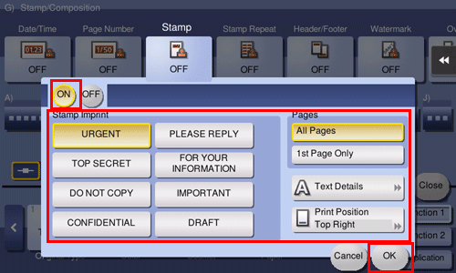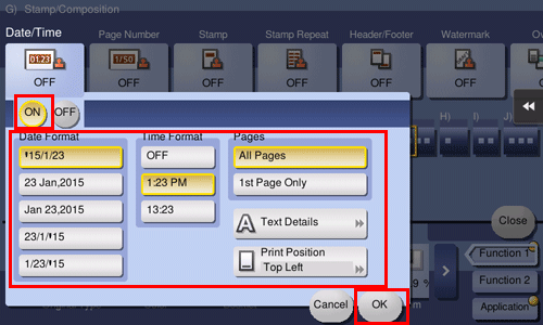 [Date/Time] | Select a format for the date and time to be printed. The date/time as of scanning the original is stamped. | |