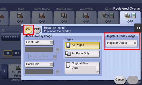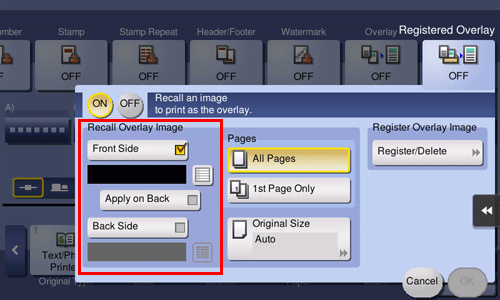 A. Yes. You can register the logos and favorite images in the storage of this machine to add such overlay images to copy outputs.