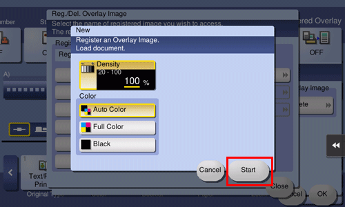 Load the original containing the overlay image to be registered, change image settings as necessary, then tap [Start].