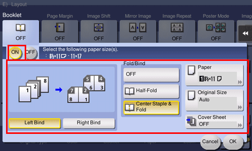 [Fold/Bind] | Select [Center Staple & Fold]. This function staples copies at two places along the center and folds the copies in half before feeding them out. |